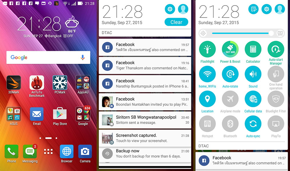 แน่นอนว่า ASUS Zenfone Max ให้ลูกเล่นเหมือกับ ASUS Zenfone ยุคใหม่เริ่มจาก Zen UI ที่จัดระเบียบและสามารถบอกข้อมูลล่วงหน้าเช่นสภาพอากาศ นัดหมาย สิ่งที่ต้องทำ และมีการตั้งค่าที่สามารถจัดการได้งาน ที่สำคัญ icon มีขนาดใหญ่กำลังดี